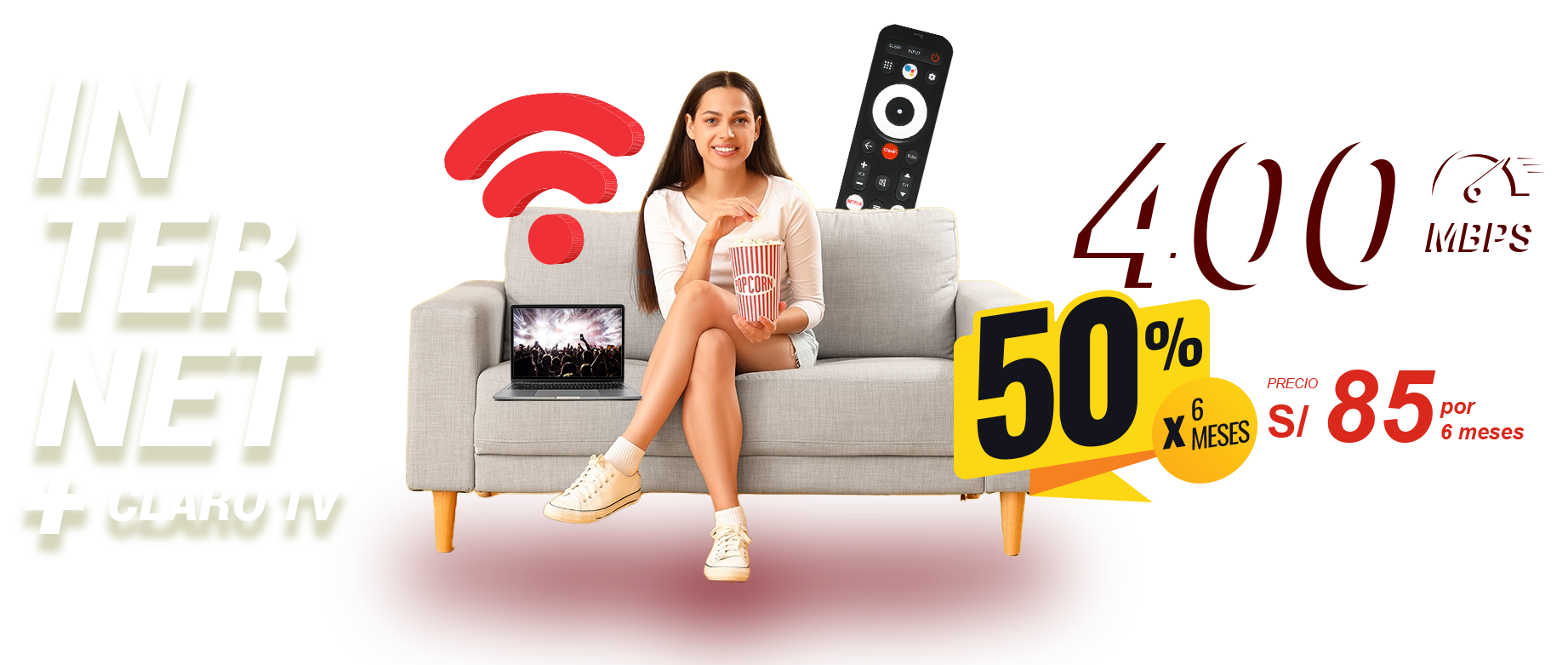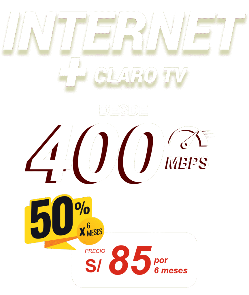 Sujeto a cobertura, evaluación crediticia y facilidades técnicas. Vale del 07/10/25 al 13/10/25, para clientes DNI y RUC 10 que contraten servicios nuevos con plazo forzoso a 6 meses. Luego de 12 meses navegarás a la velocidad del plan contratado. Bono 1000 Mbps aplica desde ciclo de facturación de la activación y se pierde con el primer pago impuntual. Tarifa de instalación a S/ 0: sujeta a evaluación crediticia y vale hasta el 30/09/25. Se garantiza el 70% de la velocidad contratada. Consulta cobertura, número de canales, costo de instalación y restricciones en claro.pe/fibraoptica.
